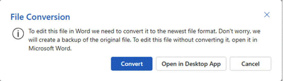 With the move to SharePoint, some older files (.doc or .xls extensions) will need to be updated to the newer format to allow all the features of SharePoint to work. I have gone through and cleaned up as many as I could but there might be a few more out there. If you are prompted to Convert the file, simply hit Convert and it will create a copy of the file in the same folder with the updated format. Below is an example of what the dialog looks like. After you convert the file, you can close out of the original and open the newly created file.