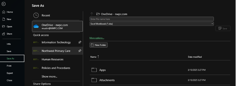 From within the Office Products (Excel, Outlook, Word, etc), you can save directly to SharePoint. When saving, select Northwest Primary Care (highlighted in Fig. 3) > Files > Department Drive and save into the folder you would like.